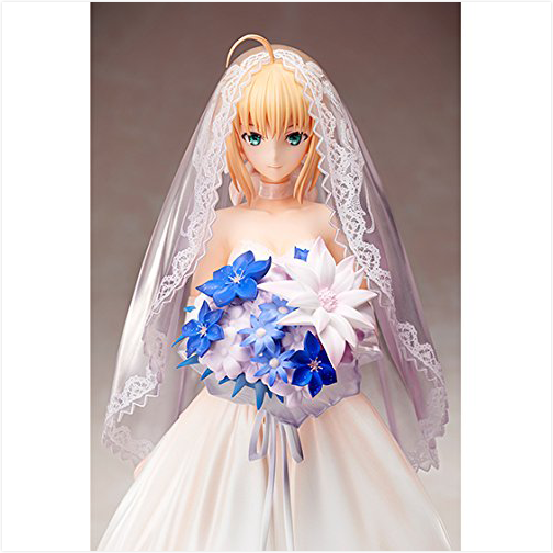Celebrating the 10th anniversary of Fate/stay night we get this wonderful statue of the most popular character of the series. Saber the almighty Servant fighting alongside her Master in the war for the Holy Grail has been sculpted by a collaboration of Aniplex and Stronger. This royal dress first appeared on the cover of the Type Moon-Fes CD. That is a concert for all fans of the games and animes that are produced by Type Moon. This beautiful Saber is very reminiscent of a bride during her wedding and she has the fitting white and blue bridal bouquet with her. The figure is produced in great detail just like you would expect from the two companies making it. You can display the girl with or without the veil whatever you like best. This dream in white is an exclusive figure but we still were able to get some for you. Don't let the chance to get this masterpiece for your collection slip by.